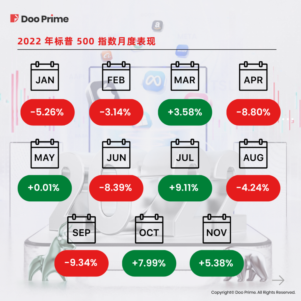 2022年,标普 500 指数的各月表现均不相同,行情出现大幅震荡,有数个月的涨跌幅度均在 10% 左右。下表则是 2022 年迄今标普 500 指数的各月表现: