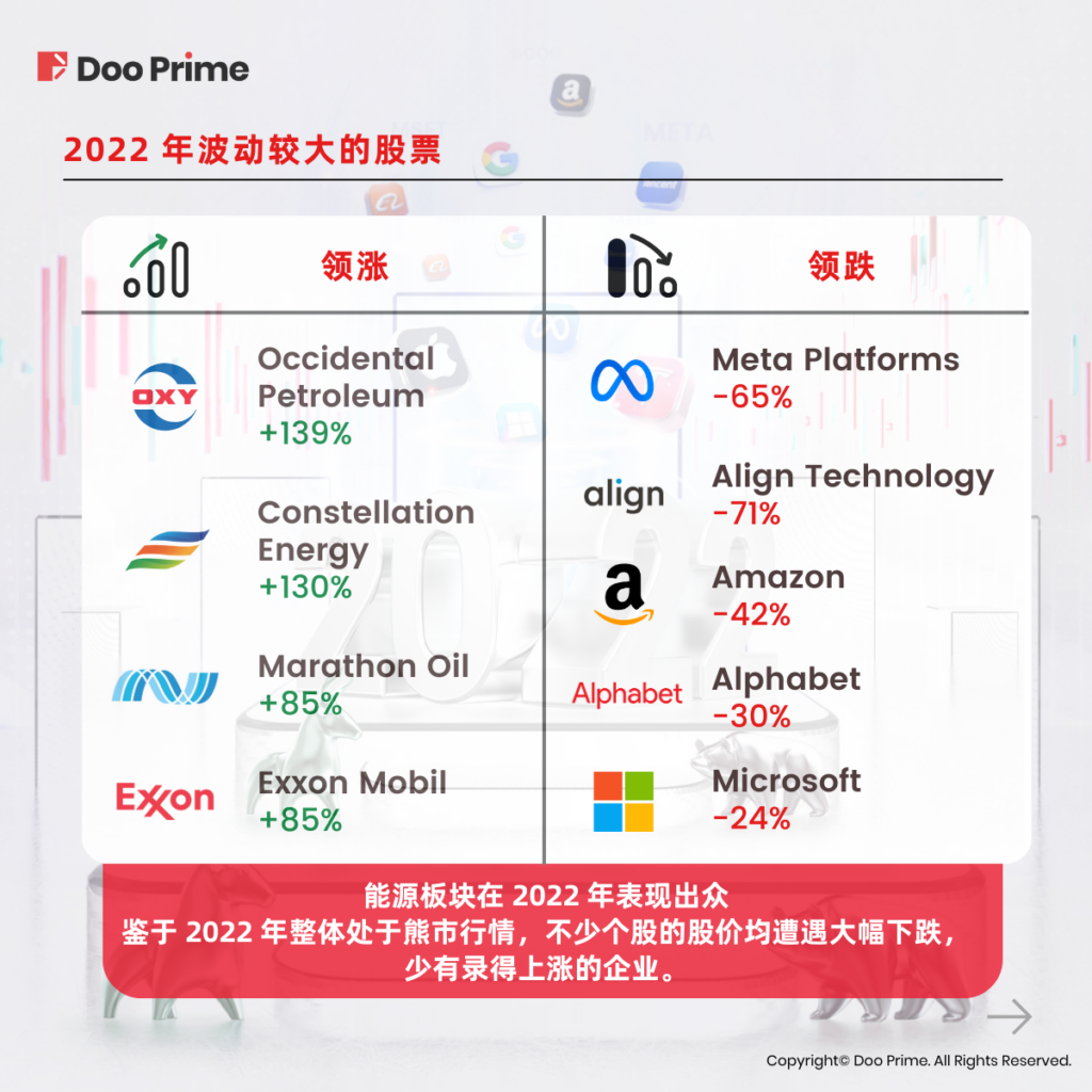 鉴于 2022 年整体处于熊市行情,不少个股的股价均遭遇大幅下跌,少有录得上涨的企业。以下便是标普 500 指数中部分大牌上市企业在今年的股价表现: