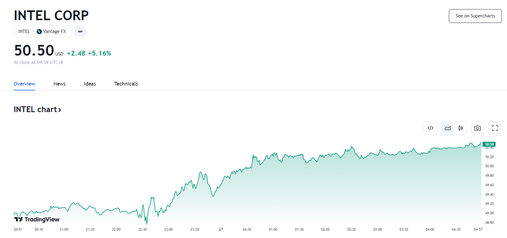 受利好消息影响,芯片股指涨 1.8%,跑赢大盘,其中 Wolfspeed 涨 5.4%,英伟达涨 0.9%,美光科技涨涨 0.6%;英特尔股价涨幅最大,收涨 5.16%,报 50.50 美元。