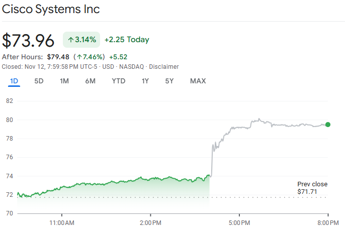 11 月 12 日至 13 日,思科(CSCO)公布 2025 财年第一季度财报,营收增长 7.5% 至 148.8 亿美元,优于市场预期的 147.7 亿美元;每股收益(EPS)1 美元,高于分析师预估的 0.98 美元。