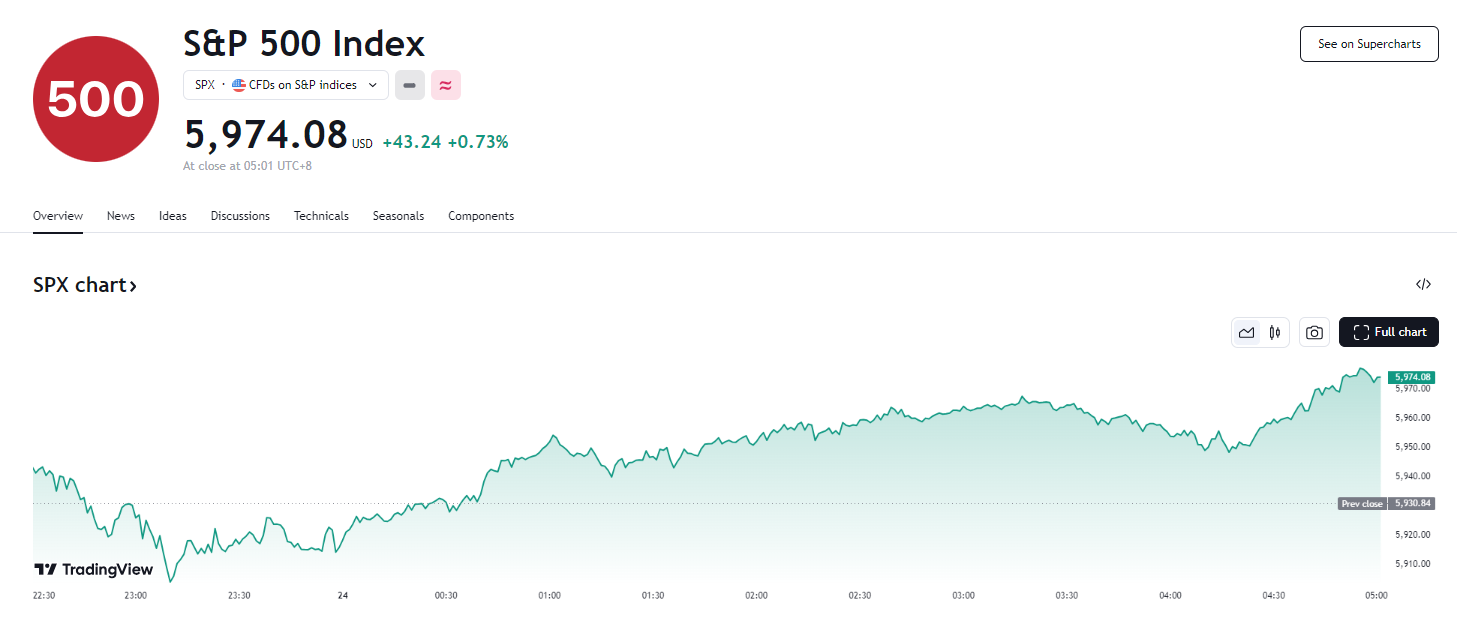 截至收盘,美股三大指数触底回升,标普 500 指数收涨 0.73%,报 5974.07 点;道指收涨 66.69 点,涨幅 0.16%,报 42906.95 点;纳指收涨 0.98%,报 19764.88 点,其中芯片指数收涨 3.1%,纳微半导体涨约 22%;纳指 100 收涨 1.01%。