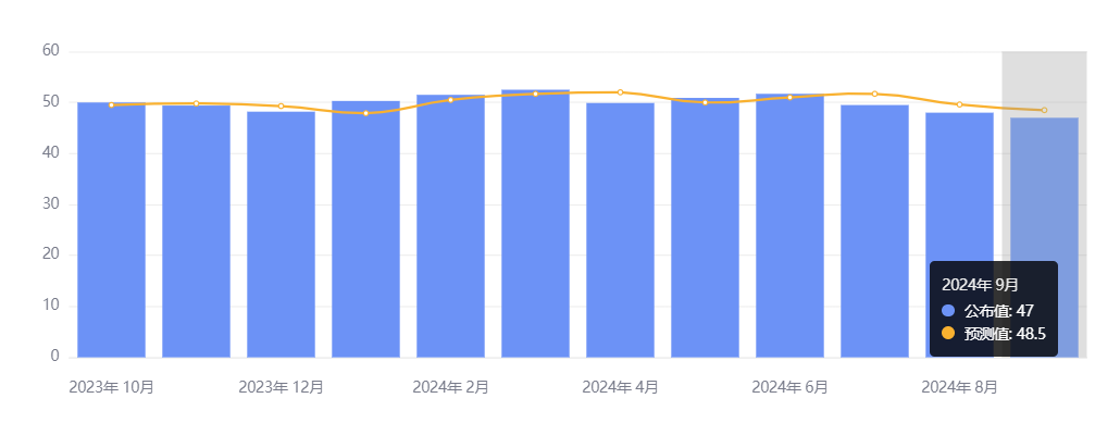 9 月 23 日,标普全球公布的数据显示,美国 9 月制造业连续第三个月萎缩,并创下 15 个月新低,服务业的扩张速度略有放缓,综合 PMI 增速下滑。具体来看,9 月制造业 PMI 初值降至 47,创 2023 年 6 月以来的最低水平,低于预期的 48.6 和 8 月前值 47.9。