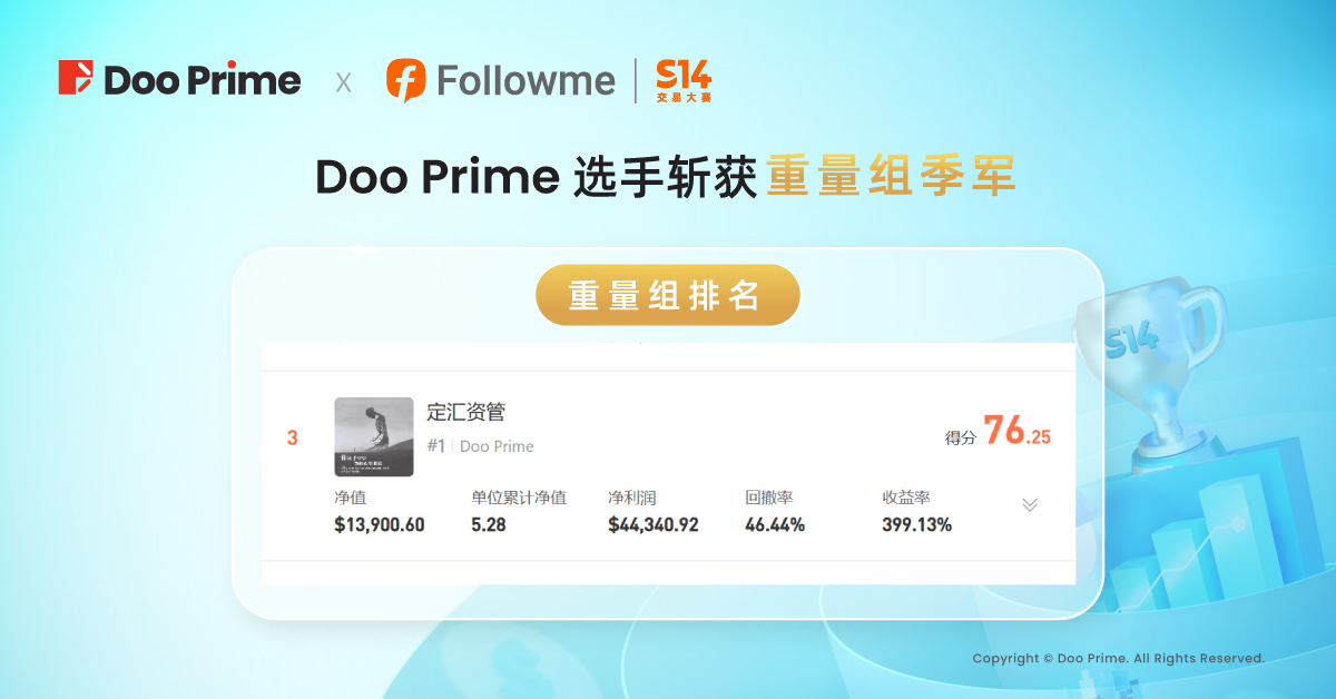 FOLLOWME S14 交易大赛完美收官,Doo Prime 再度成为 FOLLOWME 交易大赛赞助商,旨在汇聚全球优秀的交易员并提供展示实力的平台。通过大赛平台,让各路顶尖和有潜力的交易员得以共同交流切磋、分享交易心得与实战经验,共同创造投资机遇并打造良好交易环境。