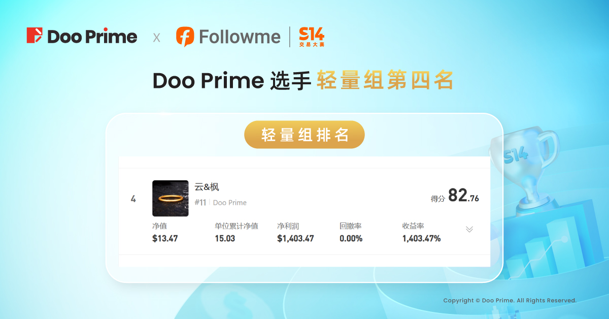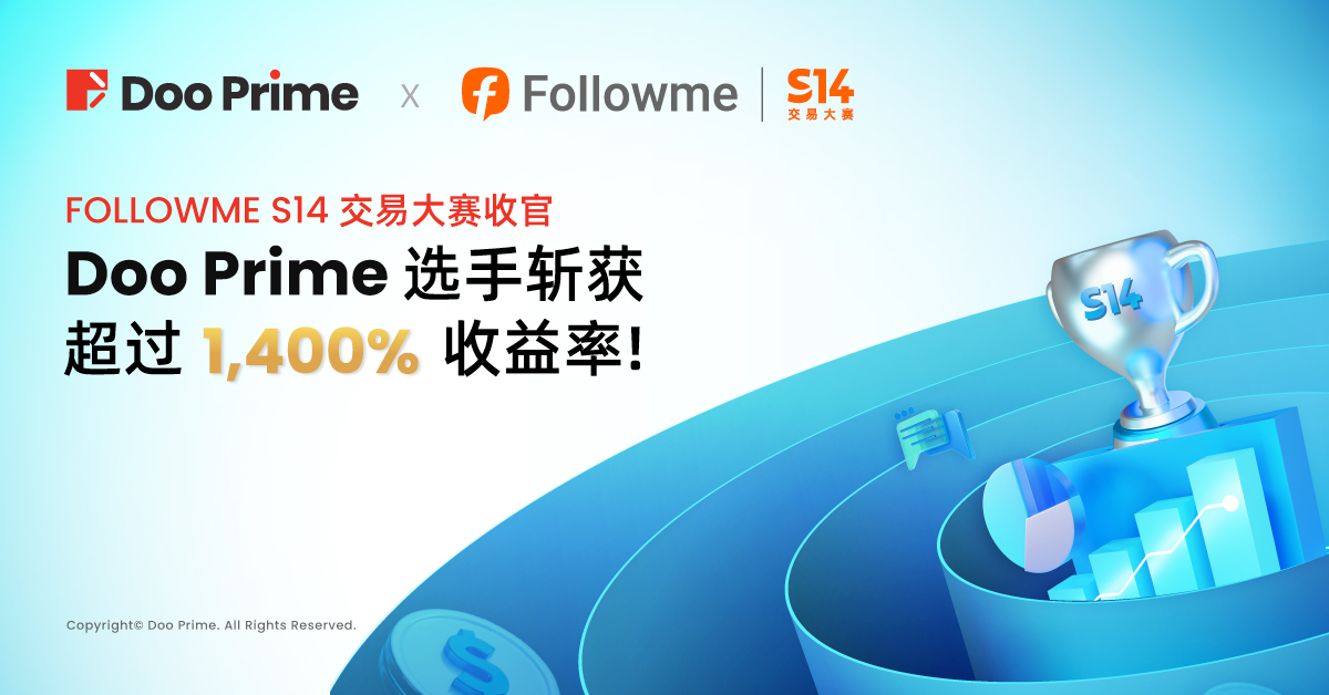 FOLLOWME S14 交易大赛已于 2024 年 7 月 21 日圆满落幕,Doo Prime 作为钻石赞助商,倾情赞助并大力支持本届交易大赛。此次赛事汇聚各路顶尖交易高手,吸引了近 9,331 个报名账户,共同角逐丰厚奖金与荣誉。