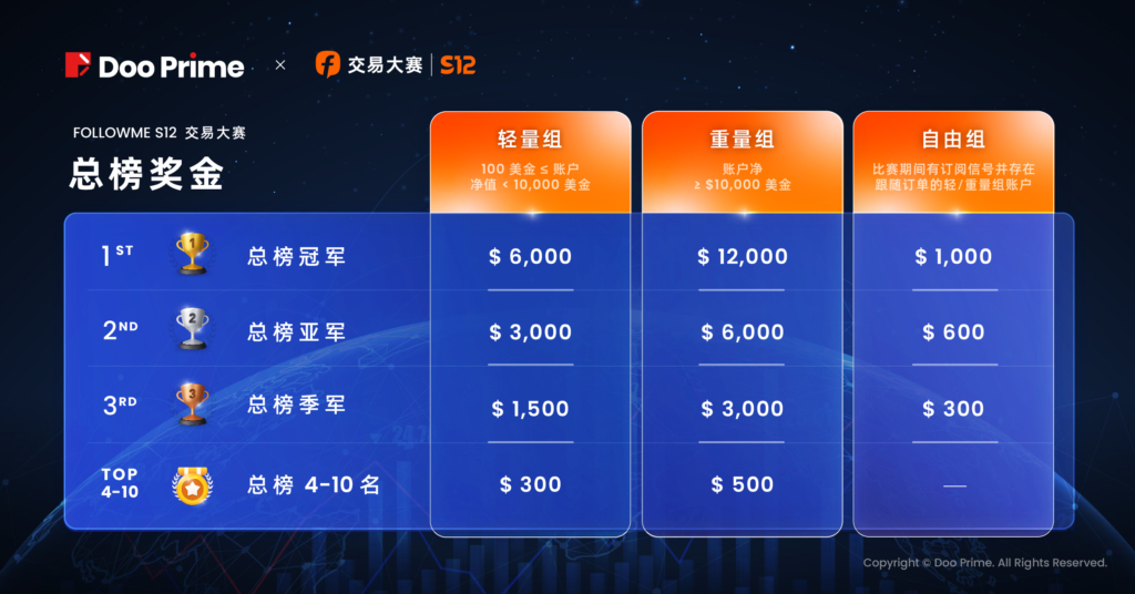 Doo Prime 再次作为 FOLLOWME 交易大赛的钻石赞助商,除了奖金与荣誉的吸引,也是平台及业内对 Doo Prime 的高度肯定。2023 年 Doo Prime 蓄势待发,始终将客户利益放在首位,力争为投资者提供良好的交易环境,严格遵守权威机构监管规范,保障客户资金财产安全;全面提供过万种交易产品,汇集 500 多位行业精英打造顶级团队,为客户提供全年 365 天不间断式专业服务;依托 Doo Prime 金融创新技术发展,实现极速交易,并以 0.1 pips 超低点差及 1:1000 优势杠杆,赋能投资者以低成本撬动大机会。Doo Prime 将以自身的全面优势,助推广大参赛客户,在 S12 交易大赛中再创佳绩。