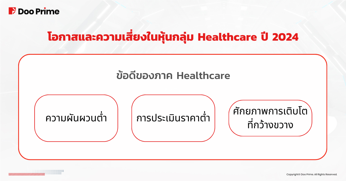 • ศักยภาพในการเติบโตกว้างขวาง ขับเคลื่อนด้วยเทคโนโลยีใหม่และความต้องการที่เปลี่ยนแปลงไป ภาค Healthcare นำเสนอโอกาสในการลงทุนมากมายภายในภาคส่วนย่อยต่างๆ การพัฒนาที่ขับเคลื่อนด้วยนวัตกรรมในภาคส่วน Healthcare คาดว่าจะนำมาซึ่งโอกาสในการลงทุนเชิงโครงสร้าง