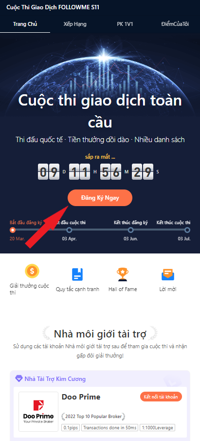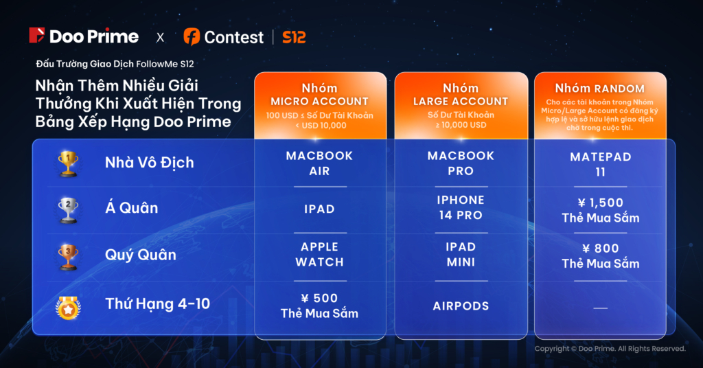 Đặc biệt, những người tạo tài khoản Doo Prime lần đầu thông qua nền tảng FOLLOWME ngay trong khuôn khổ Đấu Trường Giao Dịch FOLLOWME S12 sẽ có cơ hội giành được MacBook Pro, iPhone 14 Pro, iPad mini hoặc các giải thưởng kỹ thuật số 3C hấp dẫn bên cạnh tổng giải thưởng hơn 55,000 USD từ cuộc thi. Chúng tôi rất hy vọng được song hành cùng bạn trên hành trình giao dịch ngay cả trong và sau cuộc thi.