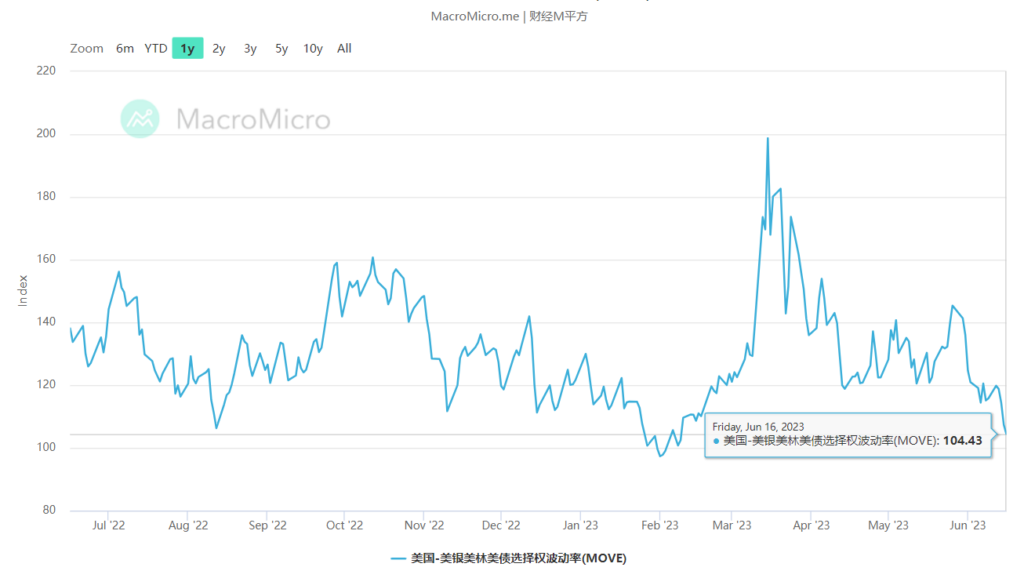 Sau thông báo của Fed, chỉ số Merrill Lynch Option Volatility Estimate (MOVE), một chỉ số đáng tin cậy về biến động của trái phiếu chính phủ Mỹ, giảm xuống 104.43 vào ngày 16 tháng 6, tiến gần đến điểm thấp nhất trước khi chu kỳ siết chặt của Fed bắt đầu. Xu hướng này cho thấy tình hình thị trường trái phiếu ổn định và giảm khả năng xảy ra bán khống.