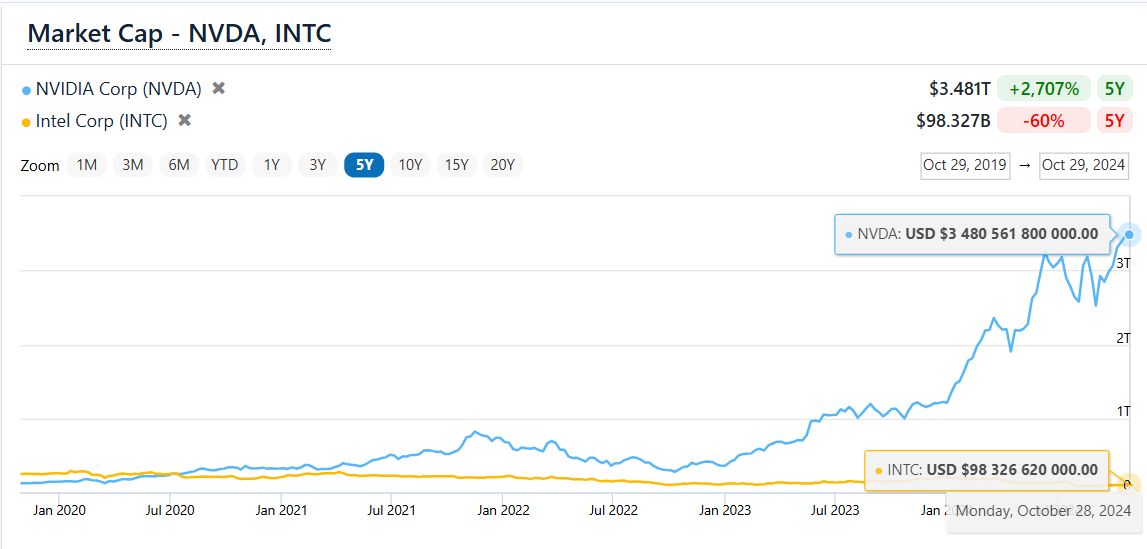 Giờ đây, sau gần 20 năm, Nvidia đã trở thành ông vua chip AI và là một trong những tập đoàn có giá trị nhất thế giới, trong khi Intel, từng là siêu cường bán dẫn, đang chao đảo và vật lộn trong cuộc này. Giá trị thị trường chứng khoán của Nvidia, trong nhiều năm chỉ bằng một phần nhỏ của Intel, hiện đã hơn 3 nghìn tỷ USD, thậm chí mới đây giá trị Nvidia đã vượt qua Apple trở thành công ty giá trị nhất thế giới. Ngược lại, giá trị vốn hóa của Intel chỉ còn dưới 100 tỷ USD – khoảng 1/30 giá trị Nvidia. Doanh thu Intel đã giảm hơn 30% từ năm 2021 đến năm 2023.